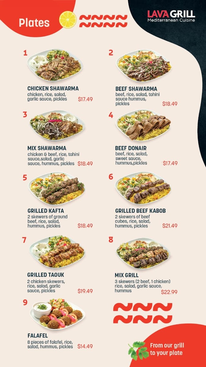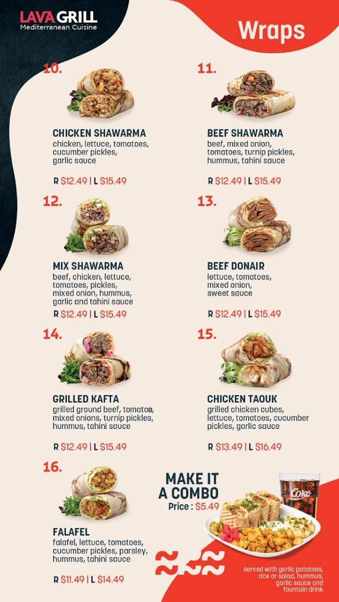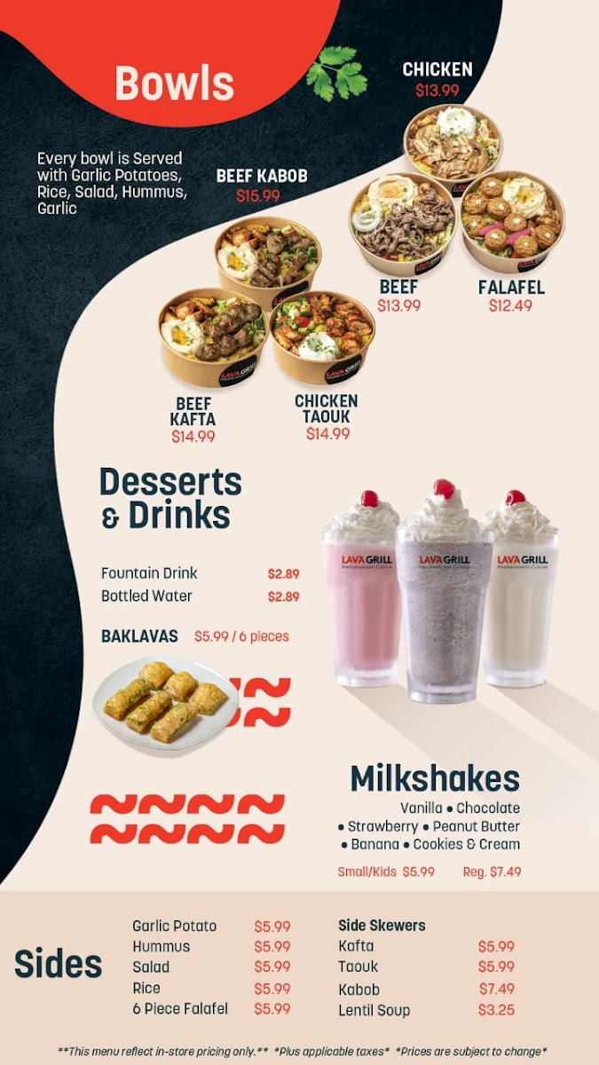 Lava Grill Premium Shawarma in Markham offers a diverse and mouth-watering menu, catering to a variety of tastes. For a refreshing treat, you can enjoy their OL-Kids Chocolate Brownie Shake or indulge in the OL-Straw Cheesecake Shake. The milkshake options also include the OL-Milkshake 12oz and OL-Milkshake 16oz for a richer experience. Their limited-time offerings include the OL-Beef Mac&Cheese and OL-Chicken Mac&Cheese, both hearty and flavorful choices. For those seeking a fulfilling meal, the plates stand out, such as the OL-Prem Mix Shawarma Plate and the OL-Prem Chicken Shawarma Plate. If you're in the mood for something lighter, the OL-Falafel Plate is a great option. Wrap lovers can choose from a selection of tasty options like the OL-Beef Shawarma Wrap or OL-Chicken Shawarma Wrap, while combos like the OL-Chicken Shawarma Wrap Combo make for a satisfying meal deal. The restaurant also offers platters, perfect for sharing, such as the OL-Shawarma Tray For 6 or the OL-BBQ Tray For 8, ideal for larger gatherings. If you're after something more individual, their bowls, like the OL-Chicken Shawarma Bowl or OL-Falafel Bowl, are perfect for a well-balanced meal. To accompany your meal, a selection of beverages like OL-Monster Original or OL-Vitamin Water XXX is available. Don't forget to complement your meal with sides such as OL-6 Piece Falafel or a delicious OL-Baklava for a sweet finish. With a wide variety of options, Lava Grill Premium Shawarma caters to every craving, whether you're in the mood for something light, hearty, or sweet.